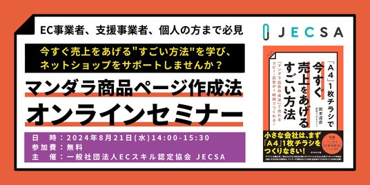 今回は一般社団法人ECスキル認定協会(JECSA)のセミナーとして、マンダラ広告作成法を使ってネットショップの商品ページ作成できる「マンダラ広告作成法」をレクチャーしていきます。今までなんとなく商品ページを作成していた、良い商品なのに売れない、転換率が上がらないとお悩みのEC事業者・支援事業者・個人の方は、ぜひご参加ください。