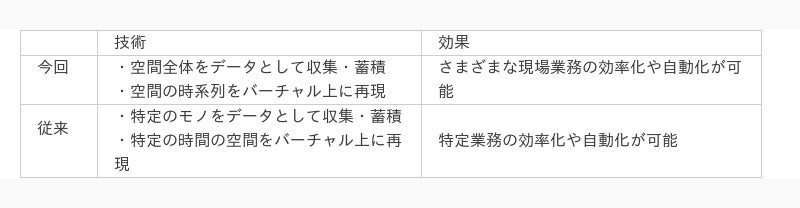 ・あらゆるモノが含まれる現実世界をバーチャル上に再現することで、例えば、現場環境のリモート化、問題分析、仮説検証、未来予測など、現実世界に対してデジタル技術を幅広く活用可能