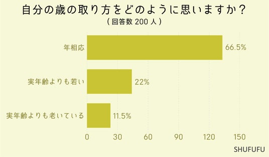 自分の歳の取り方をどのように思うかを尋ねたところ、1位は「年相応(66.5%)」、2位「実年齢よりも若い(22%)」となりました。実年齢よりも老いていると思っている方は少ないようですね。