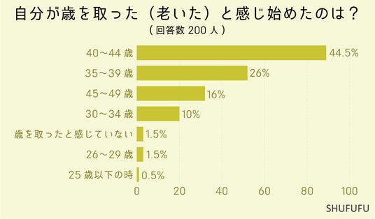 自分が歳を取った(老いた)と感じ始めたのは?の問いに対して最も多かったのが「40~44歳(44.5%)」でした。 次いで「35~39歳(26%)」「45~49歳(16%)」という結果でした。 30代後半から40代後半にかけて年齢を感じるようになった方が多いようです。