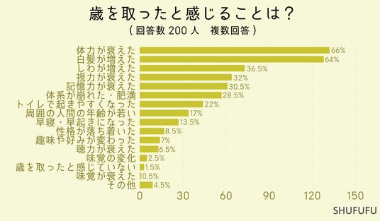 歳を取ったと感じることに関しては1位「体力が衰えた(66%)」、2位「白髪が増えた(64%)」でした。身体的な衰えから歳を取ったと感じることが多いようですね。