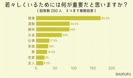 若々しくいるためには何が重要だと思うかを尋ねたところ、1位は「健康(85.5%)」、2位「運動(44.5%)」となりました。「健康」が圧倒的1位でした。体力が衰えて歳を取ったと感じる人が多かったので、健康の大切さを実感している人が多いのではないでしょうか。