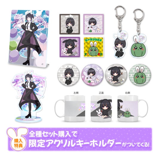 アクリルスタンド「スーツ」、アクリルパネル「スーツ」、アクリルキーホルダー「スーツ」、アクリルキーホルダー「ピーマンうさぎ」、ステッカー4種、缶バッジ4種、マグカップがセットになっています!