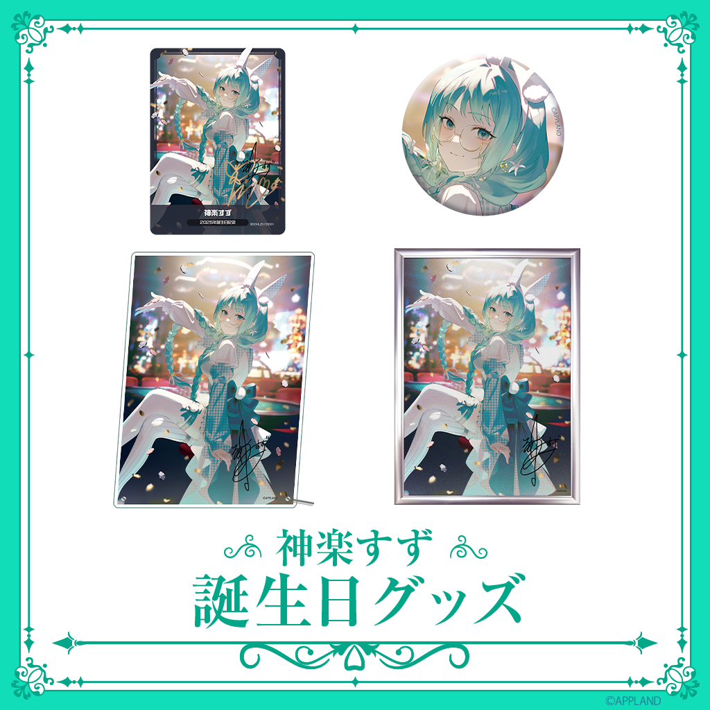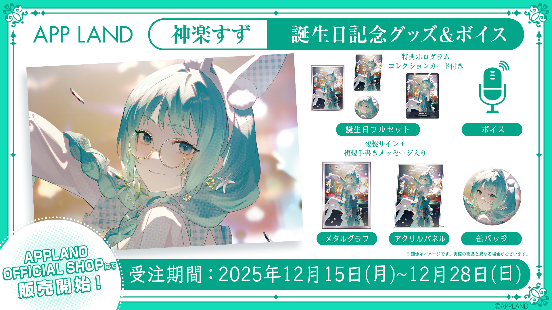2025年12月15日(月)に誕生日を迎える神楽すずの誕生日記念グッズ&ボイスを、当社が運営する公式グッズ販売サイト(APPLAND OFFICIAL SHOP)にて販売いたします!記念ボイスにはVRバージョンが用意されており、BOOTHで購入可能です。ここでしかゲットできない誕生日限定グッズ&ボイスをお楽しみください!
