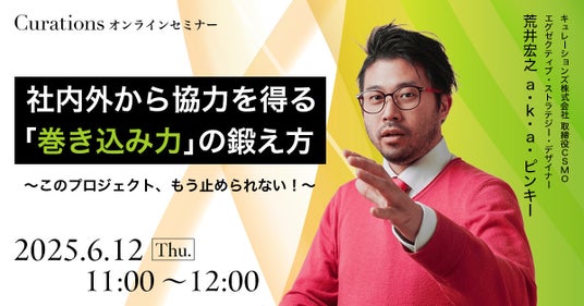 顧客企業のビジネス変革を成功に導くキュレーションズ株式会社(本社:東京都渋谷区、代表取締役社長:根本隆之、以下当社)は、「社内外から協力を得る「巻き込み力」の鍛え方 ~このプロジェクト、もう止められない!~」を2025年6月12日(木)に開催いたします。