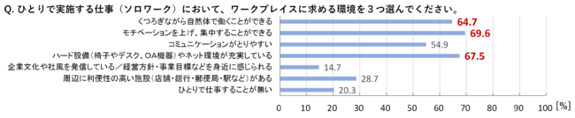 2.ひとりで仕事をする環境には、「モチベーションを上げ、集中することができる」「くつろぎながら自然体で働くことができる」「ハード設備やネット環境が充実している」ことが求められている。