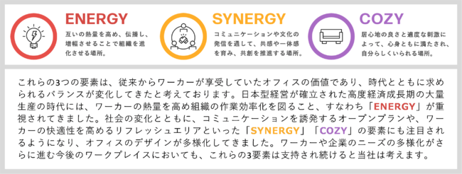 本ビジョンでは、ワーカーを惹きつけるオフィスの要素を「ENERGY」「SYNERGY」「COZY」の3つにカテゴライズしました。これらの要素を兼ね備えたオフィスを各企業のニーズに合わせて提案していくことで、ワーカー一人ひとりの目的地となるオフィスを実現します。