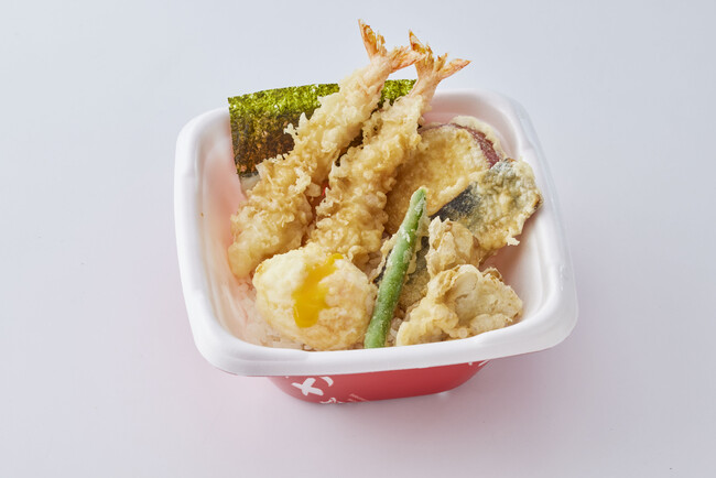 秋味たっぷりの「秋刀魚」「さつまいも」「舞茸」の天ぷらに、「海老天2尾」を加え、さらに「とろ~り半熟玉子」の天ぷらを添えた月見仕立ての天丼です。