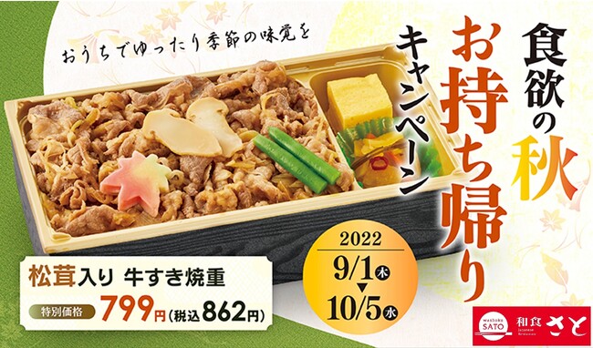 和食さとでは、9月1日(木)より秋のお持ち帰りキャンペーンとして、秋の味覚「松茸」や「秋刀魚」「さつまいも」など旬の食材を使用した豪華な弁当をご用意しました。