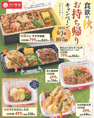 国内207店舗を展開する「和食さと」では、「食欲の秋 お持ち帰りキャンペーン」と題して、9月1日(木)から、秋の味覚の王様「松茸」を使ったお重やおそば、そして秋の風物詩「秋刀魚」やホクホクの「さつまいも」を天ぷらで楽しむ限定天丼など、テイクアウト限定の商品を10月5日(水)までの期間限定で販売します。