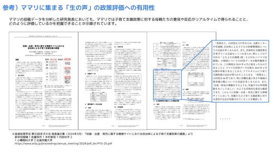 実際に、ママリの投稿データを分析した研究発表(※)において、子育て支援政策に対する母親たちの意見や反応がリアルタイムで得られること、どのように評価しているかを把握できることが示唆されています。