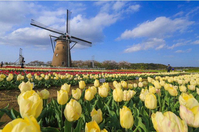 「佐倉チューリップフェスタ2022」を印旛沼湖畔の佐倉ふるさと広場で開催します。今年は、昨年よりも多い約80種類55万本のチューリップがオランダ風車を背景に彩り豊かに咲き誇ります。