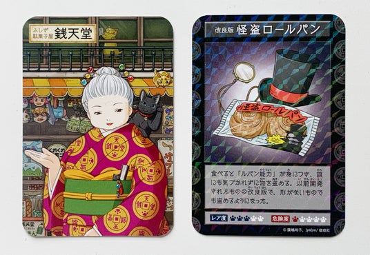 新刊発売を記念し、『ふしぎ駄菓子屋 銭天堂 吉凶通り3』には、『ふしぎ駄菓子屋 銭天堂 2』で登場した駄菓子の改良版として再登場する、「怪盗ロールパン」のキラキラ駄菓子カードがついています!