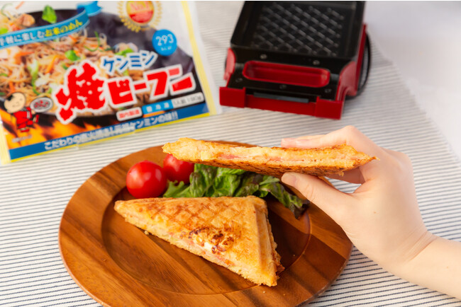 「冷凍焼ビーフン」を使ってカリッと、もちもちのホットサンドができます。具材はベーコンとチーズを使用。キャンプの朝ごはんの定番メニューである、ホットサンドが簡単にできます。冷凍焼ビーフンを使うことでボリュームたっぷりに仕上がります。