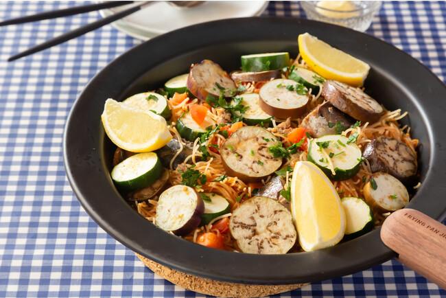 パスタで作るパエリア「フィディア」。ご家庭で揃えやすい食材で、応用が利くビーフンで作りました。フライパンひとつでおしゃれなフィディアが完成します。ビーフンは別茹で不要。時短かつ少量の水でできるので、アウトドアにもおすすめのメニューです。