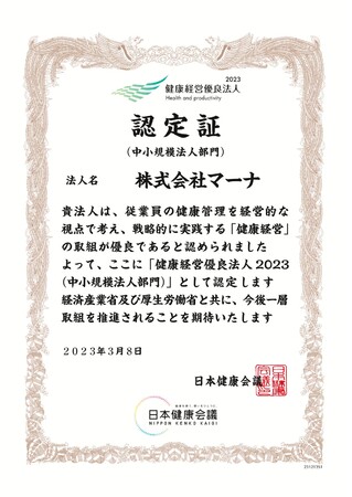 生活雑貨メーカー株式会社マーナ(東京都墨田区、代表取締役 名児耶 美樹[なごや よしき])は、経済産業省と日本健康会議が共同で選定する「健康経営優良法人2023(中小規模法人部門)」に認定されましたので、お知らせいたします。