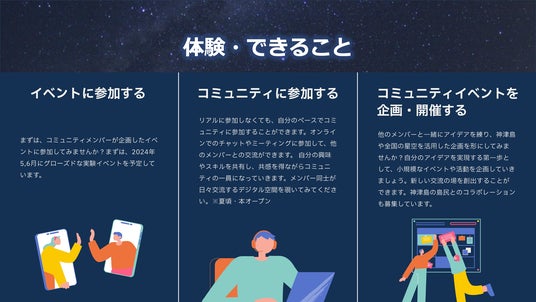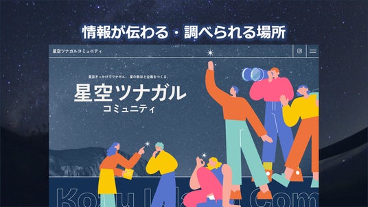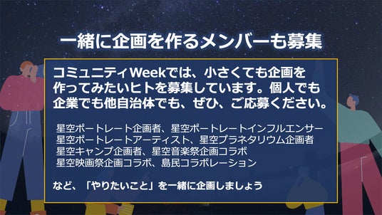日本中の星空好きとツナガルことを目指し、まずは、ちょっとでも星空好きな人たちとリアルイベントやデジタル上での交流から取り組みます。星空が好きな人・全国の星空関連の事業者・新しい体験や観光に興味がある人たち・もちろん島民とコラボレーションを生み出す共創型のコミュニティを構築していきます。具体的には、1.デジタル上のコミュニティに参加する 2.リアルにコミュニティイベントに参加する 3.企画者としてコミュニティイベントを開催・企画する、となります。