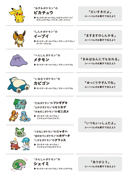 素材の風味が活きたやさしい味のお菓子を手に、ポケモンたちとおやつの時間を楽しめるラインナップです。