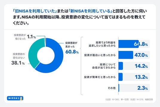 「旧NISAを利用していた」または「新NISAを利用している」と回答した方へ「NISAの利用開始以降、投資意欲の変化について当てはまるものを教えてください。」と質問したところ、「投資意欲が高まった」60.8%、「投資意欲の変化はない」38.1%、「投資意欲が低くなった」1.1%という結果になりました。