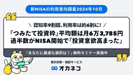 国内最大級(※1)の家計診断・相談サービス「オカネコ」を運営する株式会社400F(フォーハンドレッド・エフ、本社:東京都中央区、代表取締役社長:中村 仁、以下「当社」)は、2024年1月より開始された新NISAに関して、認知度や利用率の実態を探るべく、全国の『オカネコ』ユーザーの男女574人を対象に「オカネコ 新NISAの利用意向調査2024年10月」を実施しました。また、調査結果を受け無料のオンラインNISA解説セミナーも実施しています。