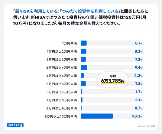 「新NISAを利用している」「つみたて投資枠を利用している」と回答した方へ「新NISAではつみたて投資枠の年間非課税投資枠が40万円(月3.3万円)から120万円(月10万円)になりましたが、毎月の積立金額を教えてください。」と質問したところ「9万円以上~10万円未満」と回答した人が50.3%と最も多く、毎月の積立金額は平均6万3,785円となりました。