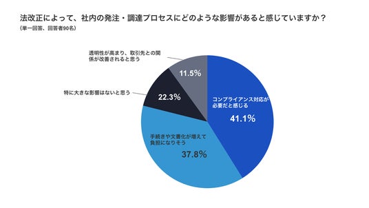 ● 法改正による発注・調達プロセスへの影響について、「取引先との関係改善」との回答は1割程度にとどまり、約8割が「コンプライアンス対応」「文書化の負担」を懸念しています。