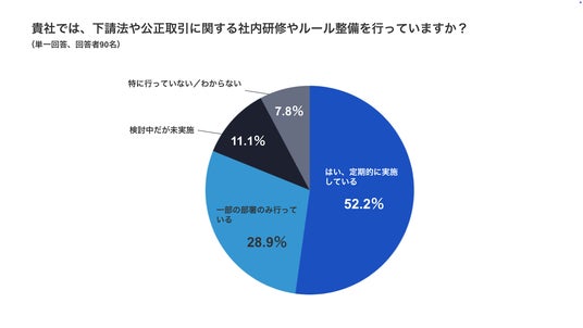 ・社内研修を定期的に実施している企業は過半数(52.2%)となり、約3割は「一部部署のみ」の実施など、組織的な対応にばらつきが見られます 。