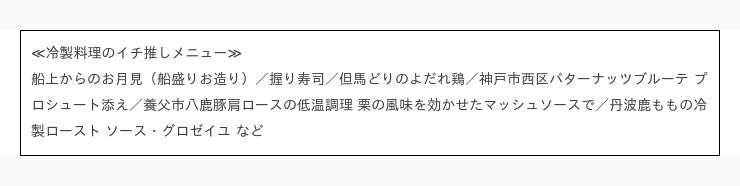 「お肉の旨みを実感できる播州赤鶏のすき焼きや、職人が丹精を込めた握り寿司、舩盛りのお造りなど、“見て愉しい” “食べて愉しい”お料理で、訪れるお客さまの大切なひとときを華やかに演出いたします。」