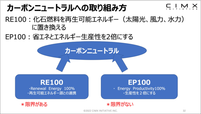 カーボンニュートラルの攻め方は2つ、RE100とEP100です。RE100は、企業が自らの事業の使用電力を100%再エネルギーでまかなうことですが、これは無理です。太陽光発電を作ってください。新電力会社との契約、グリーン証明書発行会社との契約、これは、製造業では全てコストとなります。このため、EP100が大事です。生産性を2倍にする取り組みです。