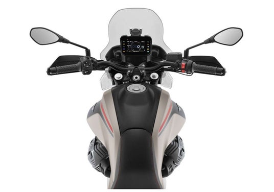 さらには、ヒーテッドグリップと、左側のハンドルスイッチで温度調整が可能なライダー側シートヒーターや、スマ ートフォンを車両に接続してメーターパネルの機能を拡張できるマルチメディアプラットフォーム(Moto Guzzi MIA)も標準装備されています。Moto Guzzi MIA は、ハンドルバー コントロールスイッチを使用して、音声アシ スタント、通話、音楽再生を管理するインフォテイメント システムを利用することができます。