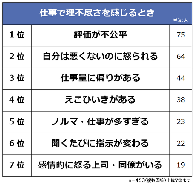 社会人500人にアンケートを実施したところ、「不公平な扱い」を理不尽だと感じている人が多くなりました。