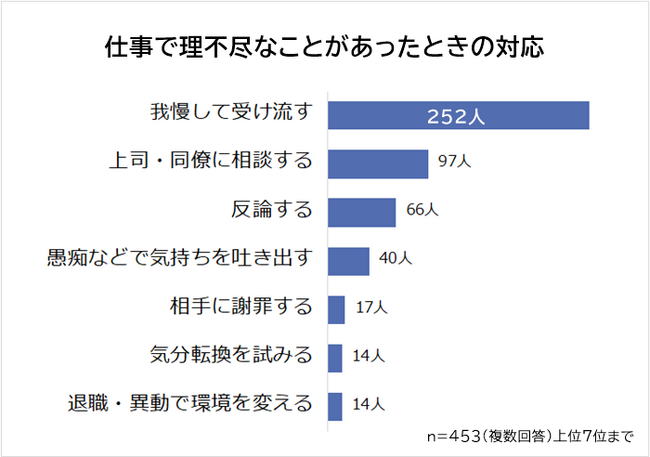 最後に「理不尽なことがあったときの対応」を聞いたところ、圧倒的1位は「我慢して受け流す(252人)」でした。