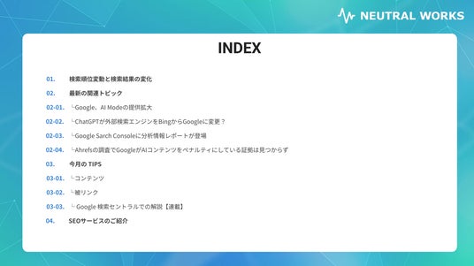 株式会社ニュートラルワークス(本社:神奈川県藤沢市、代表取締役:三木五月、以下「ニュートラルワークス」)は、自社の専門領域であるSEO対策に関して、最新の業界動向をまとめた『SEOトレンドレポート 2025年7月号』を公開いたしました。