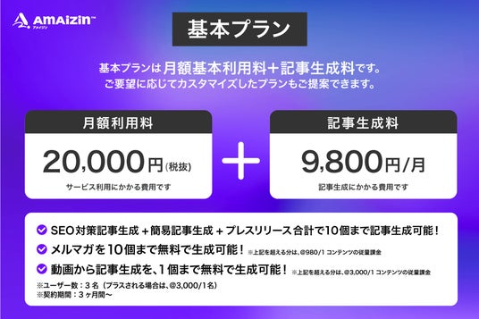 AMAIZINは、SEOライターのノウハウと生成AI(ChatGPT)を融合したAIコンテンツ生成サービスです。本特長として、「ライターの記事制作工程を再現したプロンプトの実現」や、「生成AIの活用により、SEO対策に有効なテールワード記事の量産」により、成果が出ない・続けられないといった従来の課題を解消いたします。