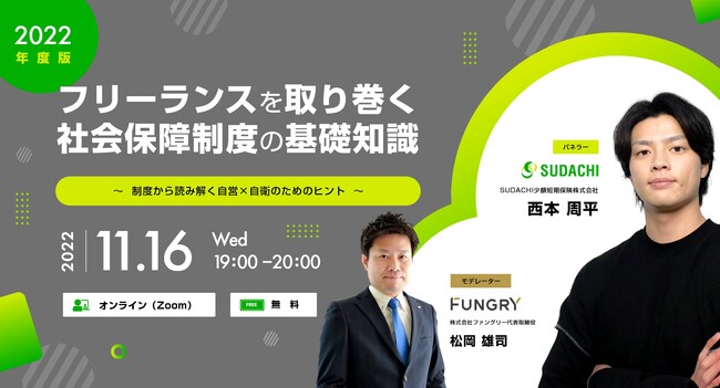 また今回の業務提携に伴い、SUDACHI少額短期保険の西本周平氏をパネラーとしてお招きし、フリーランス向けのオンラインセミナー「フリーランスを取り巻く社会保障制度の基礎知識【2022年版】~制度から読み解く自営×自衛のためのヒント~」を11月16日(水)に開催する運びとなりましたのでお知らせします。