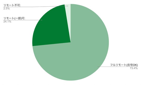 Node.js案件のリモート対応状況を見ると、フルリモート可能な案件が73.4%、一部リモート可能が24.1%、リモート不可はわずか2.5%という結果になっています。97.5%の案件でリモートワークが可能という優れた環境です。