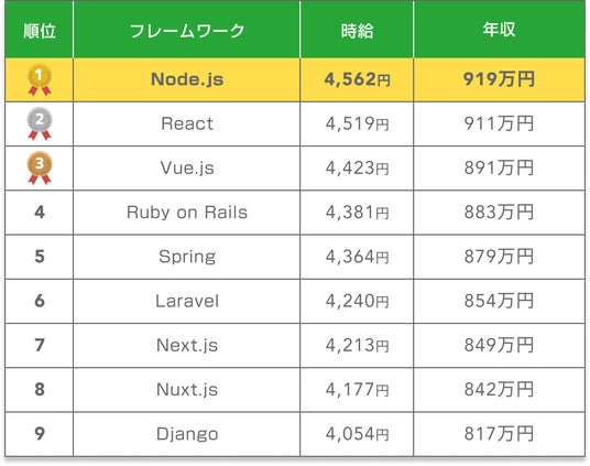 Node.js案件では、平均年収が919万円となっており、フレームワーク年収ランキングで堂々の1位という結果になっています。モダンなWeb開発において、一つの言語でフルスタック開発ができるエンジニアの希少性と市場での需要の高さが、この年収水準の背景にあると考えられます。