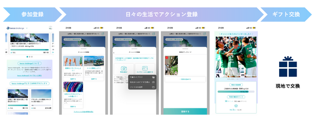 「資源をリサイクルしよう」「エコに移動しよう」「お気に入りのユニフォームを着よう」の3つのチャレンジテーマを用意し、該当するエコ活動をした際にユーザー自身のスマートフォンで写真を撮影し「becoz challenge」アプリ上に投稿いただきました。環境省が提唱する「ゼロカーボンアクション30」などのデータをもとに環境負荷を計測し、投稿回数に応じてポイントを付与しました。ポイント獲得上位者には、貴賓室での試合観戦などのギフトを用意し、松本山雅FCサポーターがチームを応援しながら楽しくサステナブルな選択をできるよう促しました。