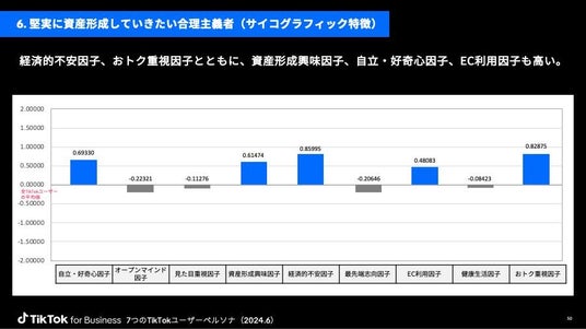 例えば、『堅実に資産形成していきたい合理主義者』の場合、「経済的不安因子」が高く、それに準ずるように「おトク重視因子」「資産形成興味因子」、さらに「自立・好奇心因子」「EC利用因子」も高くなっています。