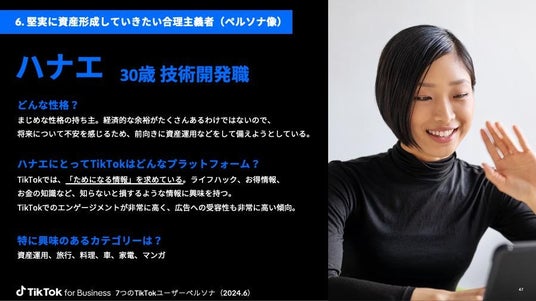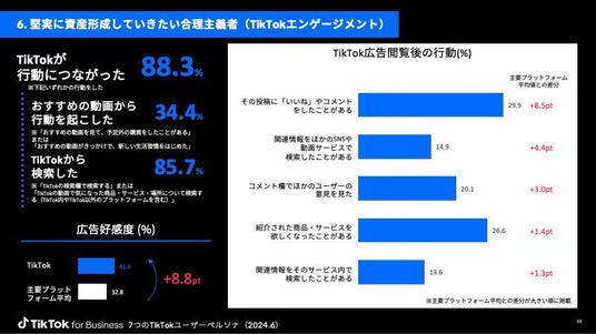 例えば、『堅実に資産形成していきたい合理主義者』の場合、TikTok広告閲覧後、「その投稿に“いいね”やコメントをしたことがある」との回答が29.9%で、主要プラットフォーム平均より8.5ポイントも高くなっています。
