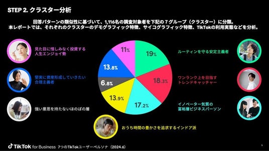 「STEP2. クラスター分析」では、回答パターンの類似性に基づいて、1,116名の調査対象者を7つのグループ(クラスター)に分類。各クラスターのデモグラフィック特徴、サイコグラフィック特徴、TikTokの利用実態などを分析しました。