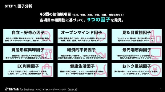 年1回行っている「TikTokユーザー追跡調査」のデータをもとに、「STEP1. 因子分析」と「STEP2. クラスター分析」を実施しました。