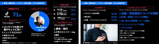 さらに、TikTokに対するイメージ、エンゲージメント率、閲覧コンテンツ、利用シーンなどTikTokの利用実態に関する調査データを紹介。