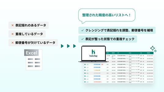 hubstepは、宛先データの整備から履歴登録までを自動化し、宛先管理業務を安全かつ効率的に運用できるクラウドサービスです。