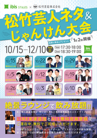 松竹芸能の若手芸人が、期間中の毎週(土)に、「イビススタイルズ大阪難波」ホテル最上階ラウンジで漫才やコントを披露いたします。じゃんけん大会ではプレゼントもあり?!