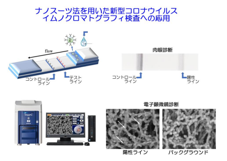 一方、イムノクロマトグラフィは操作が簡便かつ迅速で、現場の医療従事者が検査可能な非常に便利な検査ツールですが、PCR より感度が劣っていました。 近年、我々は、「生物機能の高度活用技術」の一つとして、生物試料を「生きたまま・濡れたまま」高真空を必要とする電子顕微鏡で観察できる NanoSuit(R)法を確立しました。 NanoSuit(R)溶液を塗布するだけの操作なので、より簡便・迅速に多くの試料をそのまま電子顕微鏡で観察することができるようになりました。この技術の特徴は、試料にバリア性能と導電性と洗浄効果を付与するという点です。この極簡単な操作により、既存のイムノクロマト グラフィキットの金属粒子を電子顕微鏡で観察できるのです。