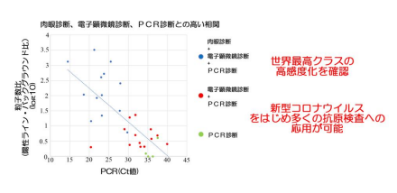 本実証実験では浜松医科大学光尖端医学教育研究センターナノスーツ開発研究部と附属病院検査部、浜松医療センターが協力して、新型コロナウイルス疑い患者に対してイムノクロ マトグラフィと PCR 検査を同時に行いました。抗原検査と PCR 検査の結果の相関性を、世界最高感度でイムノクロマトグラフィ法であるナノスーツ法-卓上電子顕微鏡を用いて調べました。その結果、我々の方法を用いることで、通常の市販の新型コロナウイルス検査用イムノクロマトグラフィキットでも、迅速にPCRに匹敵する高感度な検査を実施できることがわかりました。