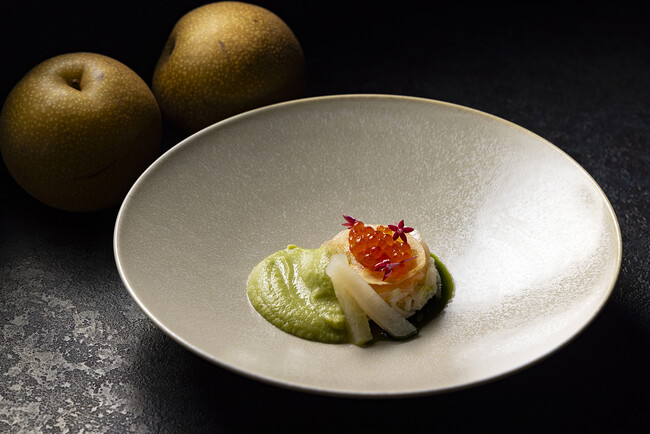鳥取特産の梨を救済するため考案。傷がついてしまった梨を、見た目にも美しい前菜へ昇華しました。新鮮な梨と青りんごをたっぷりと使ったソースが、肉厚なホタテの旨味を引き立てます。白ワインでコンポートした梨を添え、梨ずくしに。トップには焼いた梨のチップスと濃厚ないくらをのせ、サステナブルながらも贅沢な前菜です。