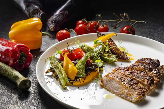 「山形豚ロインのグリル 島根県産お任せ野菜のロースト イカ墨クランブル」