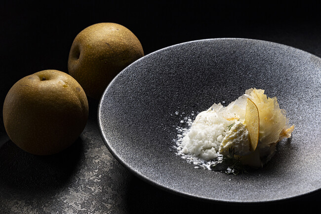 「鳥取県産梨のコンポート クレームダンジュ ヨーグルトグラニテ レモングラスジュレ」